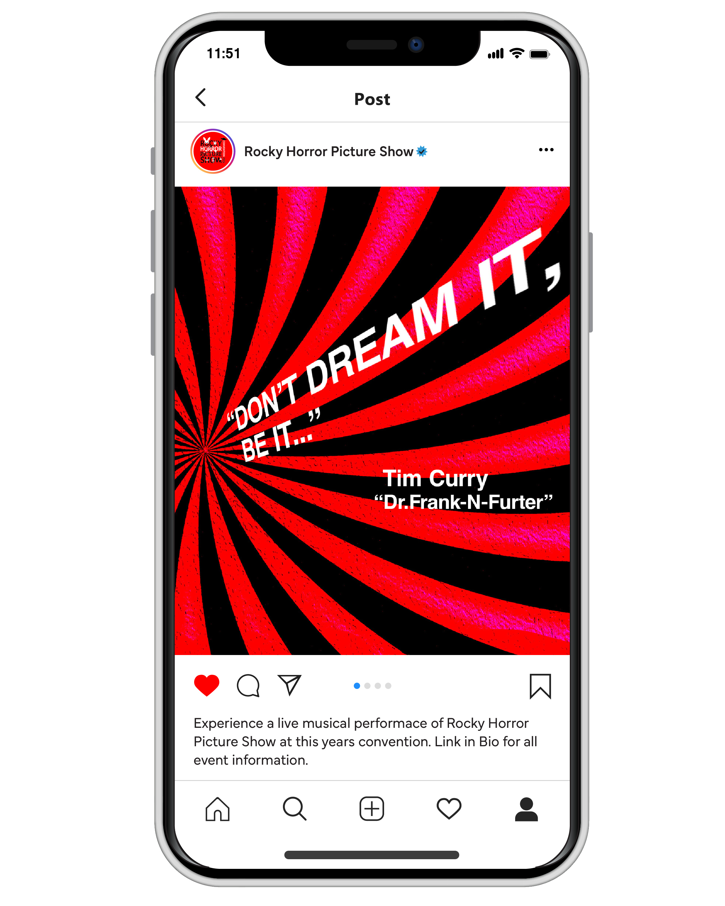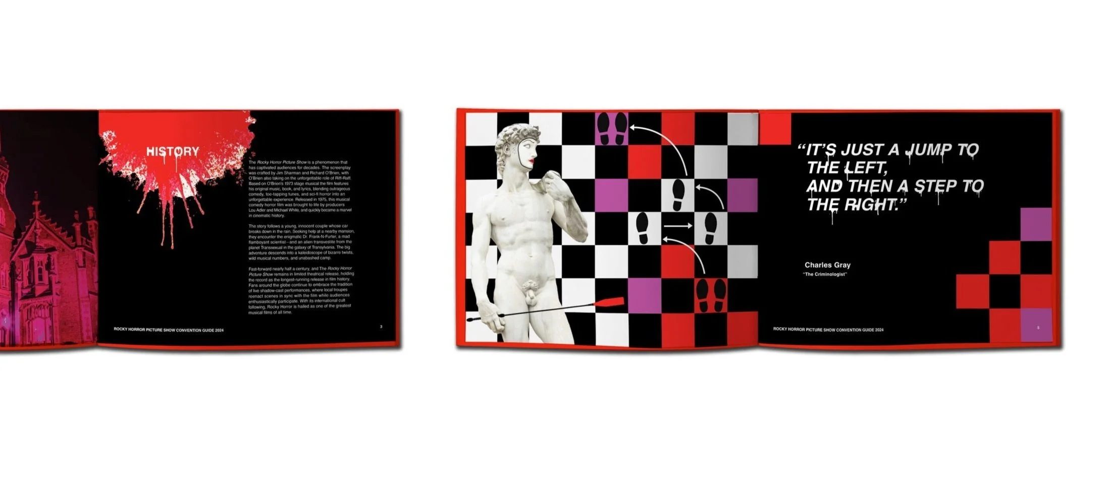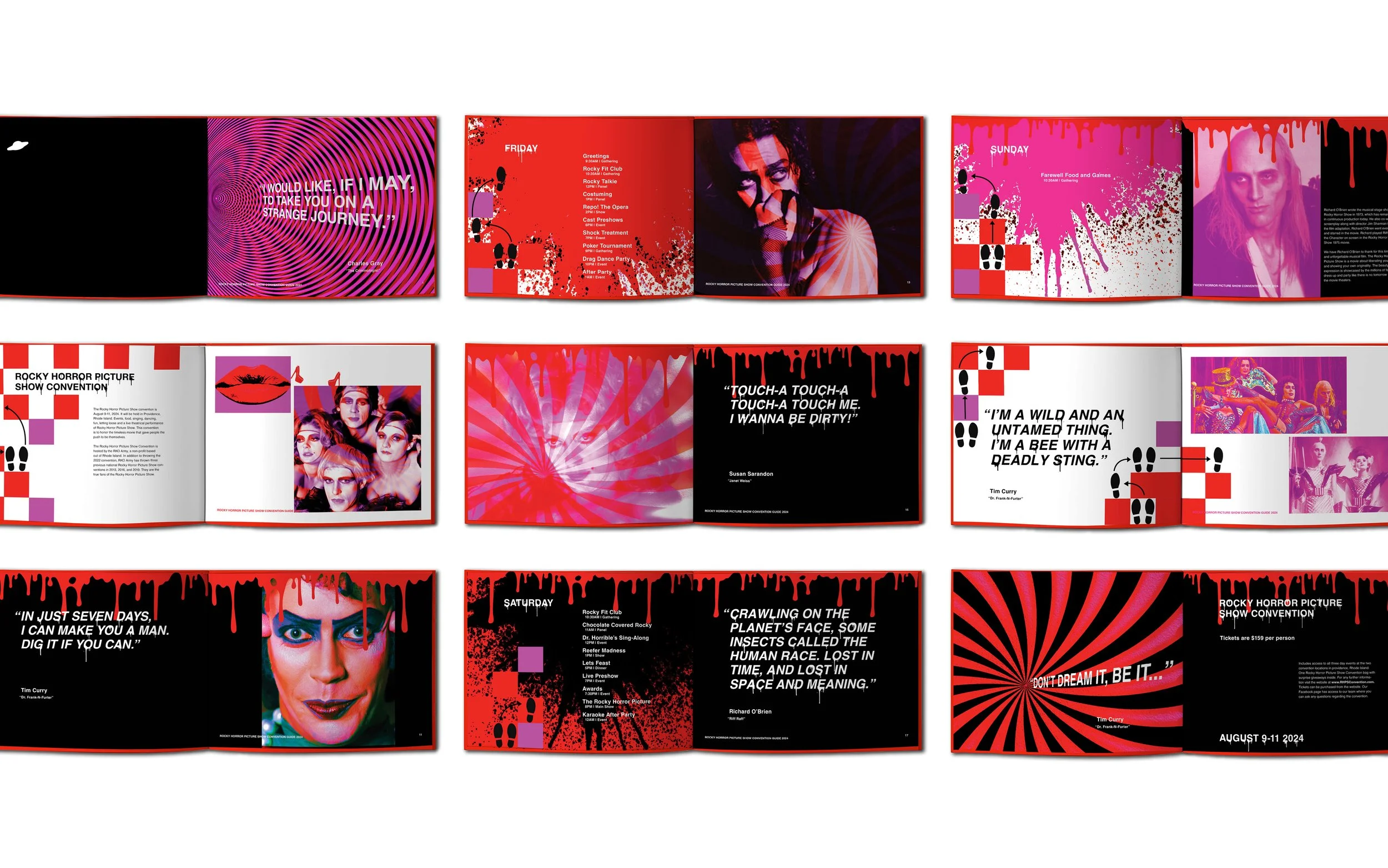 To design an engaging experience through the convention brochure, social media, and other deliverables. The visual identity should capture the culture, bravery, and seductive nature that flows through The Rocky Horror Picture Show and its film legacy. The purpose is to connect the audience to the cult classic, showcase the characters’ unique individuality, and generate interest and excitement around the event.